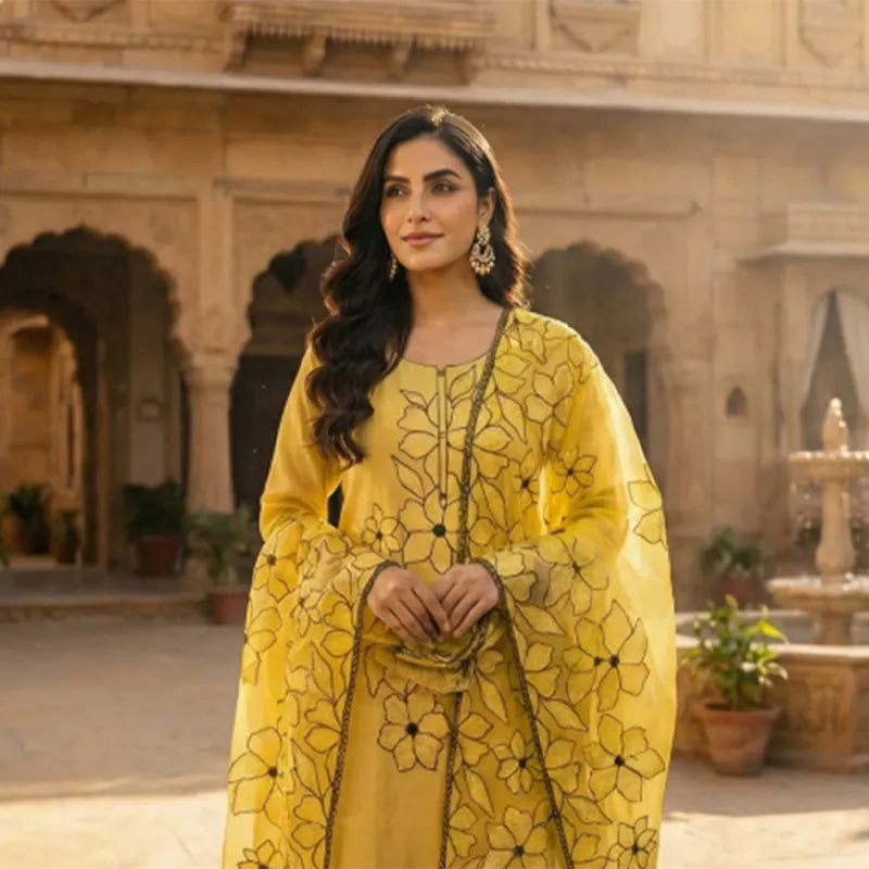 Women’s Cotton Readymade Ethnic Kurta Pant Set with Net Dupatta