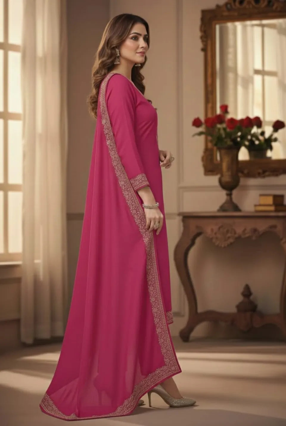 This women’s pashmina unstitched suit set is designed for comfortable and elegant winter wear. Made from soft pashmina fabric, it provides warmth while maintaining a graceful ethnic look.