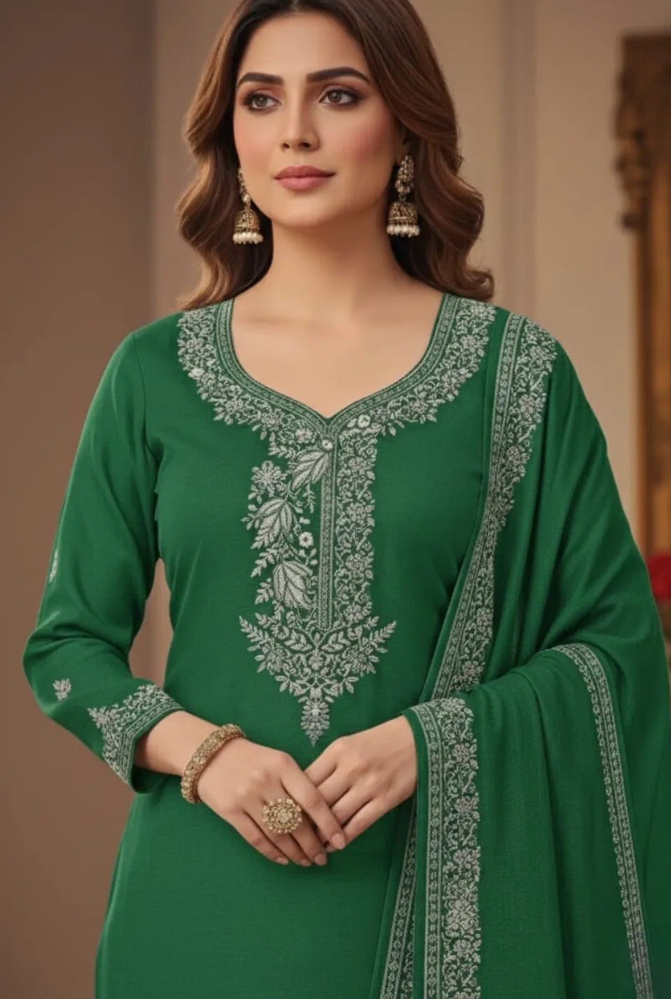 Available in peach and green colors, this unstitched suit set is ideal for winter ethnic wear, festive occasions, and daily use.